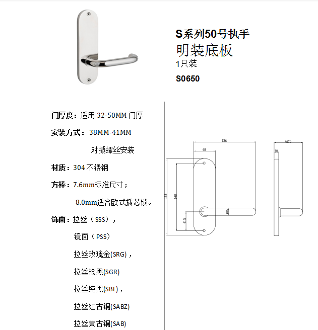 S係列50號執手 明裝底板